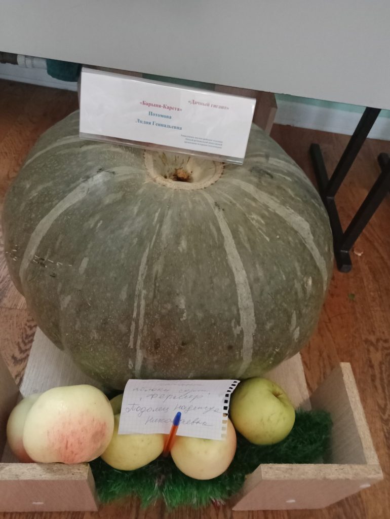 Тыква «Барыня –карета», весом 32 кг, предоставленная огородниками из Хуторов, отмечена как «Гигант».